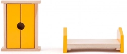 W zestawie znajduje się komplet mebli, w tym łóżka, stoły, krzesła i inne elementy.