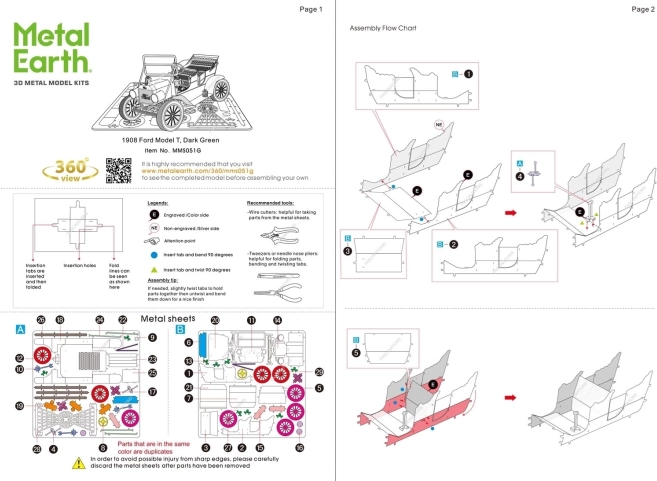 Zestaw zawiera dwa stalowe arkusze, z których złożysz szczegółowo dopracowany model. Uwaga: narzędzia nie są częścią opakowania. Do łączenia elementów zaleca się użycie małych szczypiec i cążek. Po połączeniu wszystkich części powstanie mistrzowski model historycznego samochodu Ford.