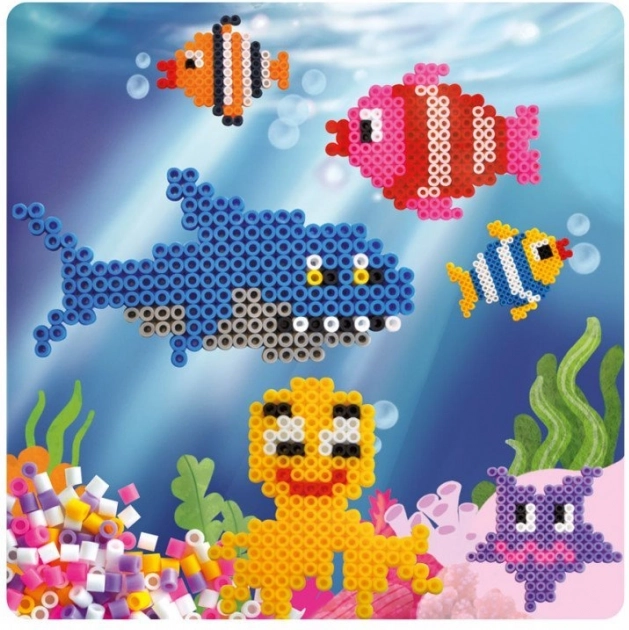 Z tym kompletnym zestawem zgrzewanych koralików stworzysz oryginalne podwodne motywy lub własne projekty. Wystarczy ułożyć koraliki na podkładce według szablonu lub wyobraźni, przykryć papierem do pieczenia i krótko przeprasować. Efektem są trwałe obrazki, ozdoby lub zawieszki, które ucieszą małych i dużych twórców.