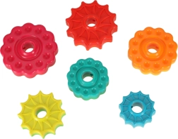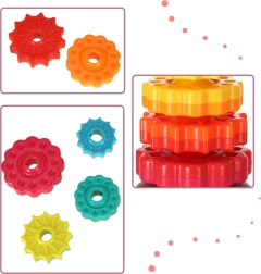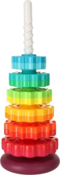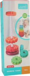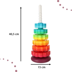 Ta kolorowa spiralna wieża łączy ruch, kolory i faktury w jedną angażującą całość. Dzieci nakładają zębate krążki na plastikowy spiralny pręt, obserwują ich rotację i słyszą delikatne dźwięki podczas zsuwania się. Zabawa wspiera koordynację ręka–oko, zrozumienie zależności przyczyna–skutek oraz sortowanie według wielkości i kolorów.