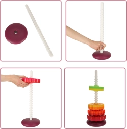 Duże elementy z wytrzymałego plastiku dobrze leżą w dłoni i są bezpieczne także dla najmłodszych. W zestawie znajdziesz 6 krążków, pręt i stabilną podstawę – łącznie 8 elementów. Proste czyszczenie i solidne wykonanie gwarantują, że zabawka sprawdzi się każdego dnia.