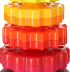Duże, łatwe do chwytania elementy ćwiczą chwyt, przekładanie i układanie. Nasycone kolory zachęcają do segregowania według wielkości i odcieni, wspierając logikę, koncentrację i kreatywność.