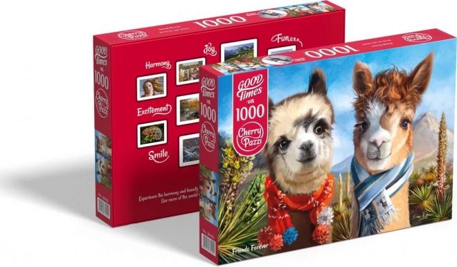 Stylowe puzzle CHERRY PAZZI „Przyjaciele na zawsze” zachwycają czarującym motywem dwóch alpak w barwnych szalikach na tle gór i błękitnego nieba. Dzięki przemyślanemu układowi elementów i wysokiej jakości nadrukowi układanie jest płynne i przyjemne zarówno dla początkujących, jak i doświadczonych miłośników puzzli.