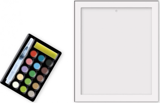 Zawartość opakowania: 2 obrazki, paleta z farbkami, pędzel napełniany wodą i ramka.