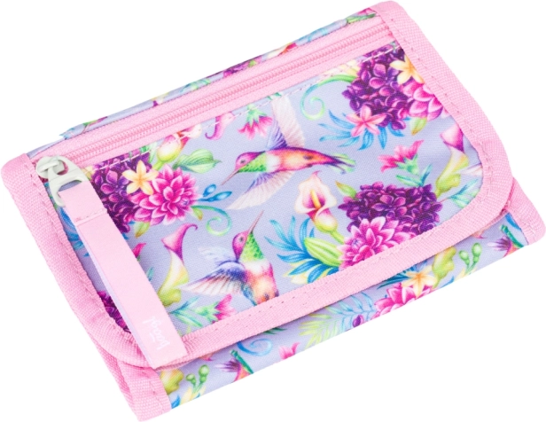 Portfel szczyci się pięknym wzorem kwiatów i kolibrów, który przyciąga uwagę i dodaje stylu każdej stylizacji.