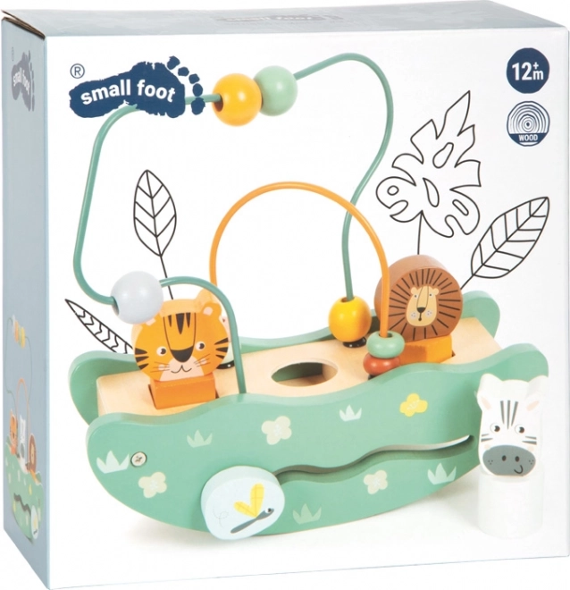 Drewniana zabawka w motywie safari obejmuje kolorowe koraliki oraz figurki lwa, tygrysa i zebry dla radosnej nauki przez zabawę.