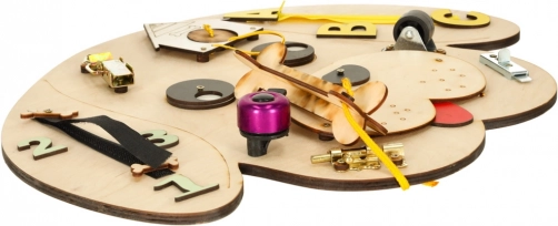 Zamek błyskawiczny, zatrzaski, klamry, łańcuszki i ruchome kółko utrzymują uwagę i uczą dzieci praktycznych umiejętności w codziennych czynnościach.
