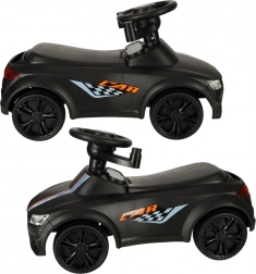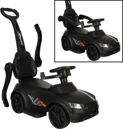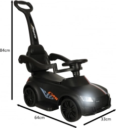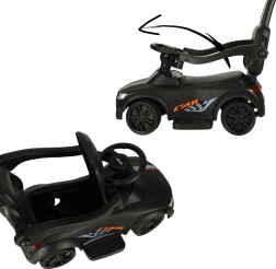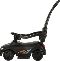 Czarny jeździk–pchacz 3w1 rośnie razem z dzieckiem od 12 miesięcy: oferuje rączkę prowadzącą dla rodziców, barierki bezpieczeństwa i oparcie na pierwsze przejażdżki oraz możliwość stopniowego demontażu do samodzielnej jazdy odpychanej. Realistyczne efekty świetlne i dźwięki (na 3× AA) zamieniają każdą jazdę w świetną przygodę.