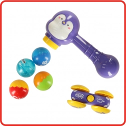 - Bogate akcesoria: 4 kulki, autko, dziecięcy młotek.