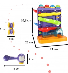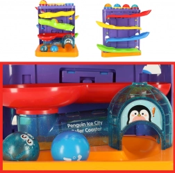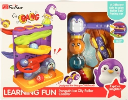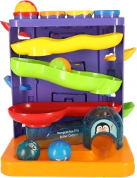 Interaktywny kulodrom z motywem uroczego pingwina to świetny wybór na pierwszą techniczną zabawkę. Dzieci umieszczają kulki w górnych otworach i za pomocą młotka bezpiecznie „wybijają” je na tor. Kolorowe trasy i płynne zjazdy zapewnią mnóstwo radości, wspierając cierpliwość i koncentrację.