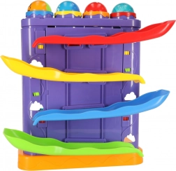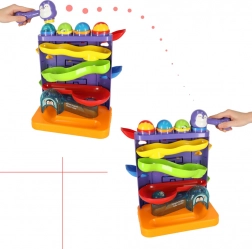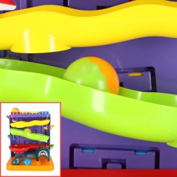 Zabawny i kolorowy tor kulkowy 3w1 dla dzieci od 3 lat oferuje dwa niezależne obiegi – jeden dla kulek, drugi dla autka. Dzięki młotkowi dzieci wprawiają kulki w ruch z górnych otworów i obserwują ich zjazd w dół. Zabawka rozwija małą motorykę, koordynację ręka–oko i w naturalny sposób wyjaśnia zasady grawitacji. W zestawie znajduje się 4× kulka, autko i młotek.