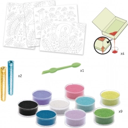Zestaw zawiera: 4 obrazki, 1 szpatułkę, 9 pojemniczków z kolorowym piaskiem i 2 tubki błyszczącego brokatu.