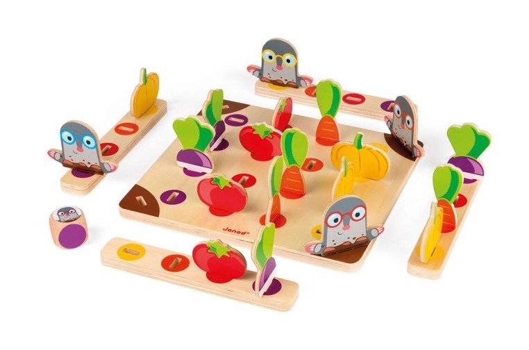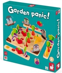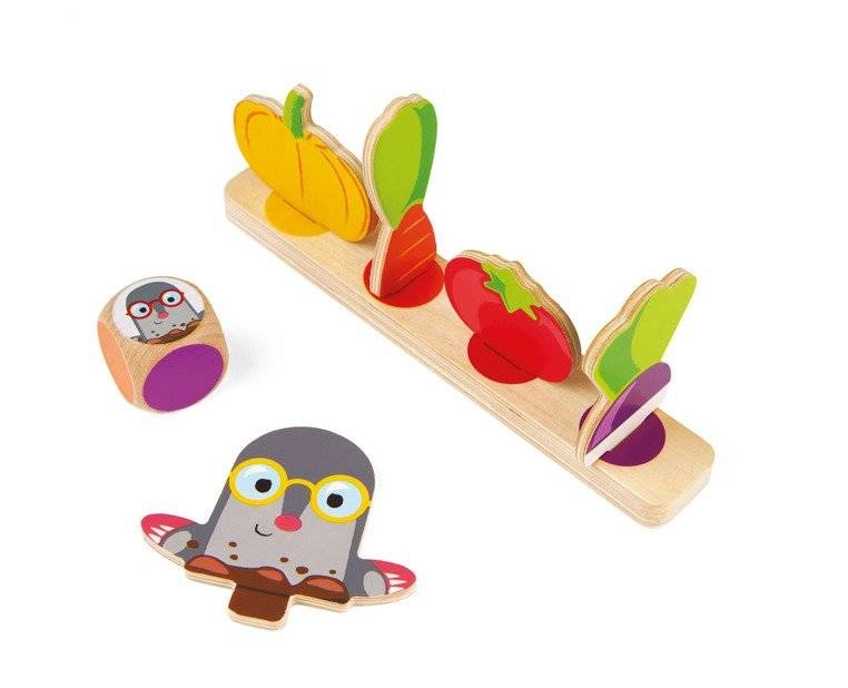 Ta drewniana gra towarzyska stawia graczy w roli ogrodników: na planszy rosną kolorowe „grządki” z pomidorem, marchewką, dynią i burakiem, a w rogach czają się krety. Rzucacie kostką – kolor oznacza plon, który wkładacie do koszyka, natomiast kret chwilowo wstrzymuje wasze zbiory. Wygrywa ten, kto jako pierwszy zgromadzi po jednym egzemplarzu każdego plonu.