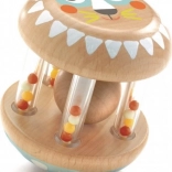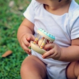 Drewniana grzechotka z koralikami i kuleczką jest łatwa do uchwycenia przez dziecięce rączki. Wymiary grzechotki: 5,6 × 5,6 × 6 cm.