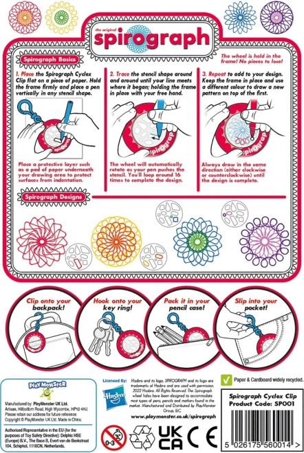 Odkryj zabawę z kieszonkowym SPIROGRAPH Cyclex – praktycznym brelokiem do kluczy, który pozwala tworzyć spiralne i geometryczne wzory zawsze i wszędzie. Przypnij go do torby, plecaka lub kluczy, a dzięki niewielkim rozmiarom zawsze będziesz mieć go pod ręką. Zawiera 1 szablon z 10 kształtami oraz instrukcję z proponowanymi wzorami na tylnej stronie opakowania.