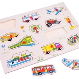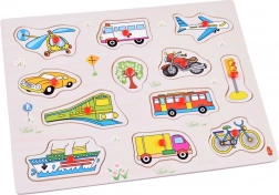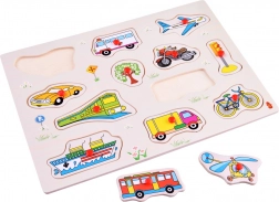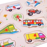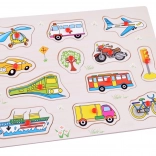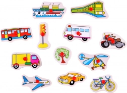 Drewniane puzzle środki transportu łączą zabawę i naukę. Dzięki nim dzieci uczą się rozpoznawać różne środki transportu, a jednocześnie doskonalą swoje umiejętności motoryczne. Każdy z 12 elementów można łatwo chwycić dzięki małemu czerwonymu uchwytowi.