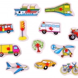 Puzzle wspierają rozwój poznawczy i uczą dzieci rozpoznawania kolorowych kształtów oraz środków transportu.