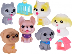 Każdy pies po naciśnięciu wydaje zabawny piszcząc dźwięk, a na dolnej części mały otwór. Zestaw zawiera różne rasy, takie jak buldog, shiba inu, pudel, wyżeł weimarski, mops i krótkowłosy chihuahua, każdy z własnymi uroczymi dodatkami. Dodatkowo zawiera mini budę i transporter.