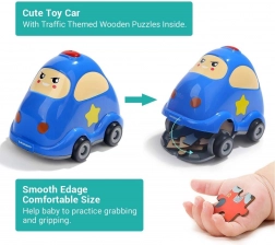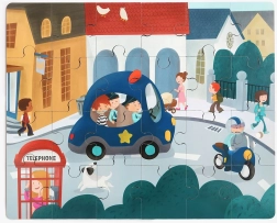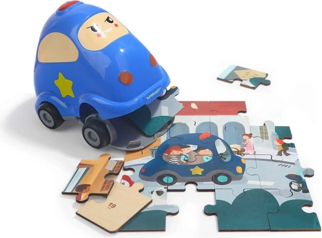 Odkryj radość układania z TOP BRIGHT: wewnątrz uroczo wyglądającego policyjnego samochodziku kryje się wysokiej jakości drewniane puzzle o tematyce transportowej. Samochodzik wykonano z wytrzymałego plastiku, ma działające kółka oraz od spodu otwieraną klapkę, dzięki czemu wszystkie elementy wygodnie schowasz w środku.