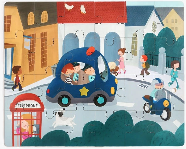 Dokup także inne środki transportu (wóz strażacki, szkolny autobus, buldożer, helikopter, statek). Brzegowe elementy łączą się ze sobą, tworząc długie panoramiczne puzzle oraz kolekcję jeżdżących zabawek.