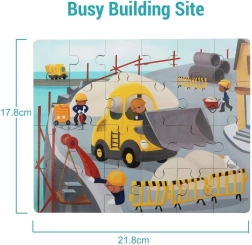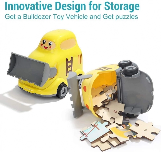 Odkryj sprytną zabawkę, która łączy radość z zabawy z nauką. Drewniane puzzle z motywem pojazdów (plac budowy) są schowane bezpośrednio w plastikowym buldożerze. Ten ma gładkie, bezpieczne wykończenie, kółka do jazdy oraz otwierane dolne wieczko, do którego dzieci wygodnie schowają puzzle lub swoje skarby.
