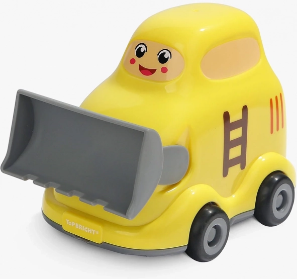 Buldożer z wytrzymałego plastiku ma gładkie krawędzie, jeździ na kółkach i oferuje praktyczne otwierane wieczko do przechowywania elementów lub drobnych skarbów.