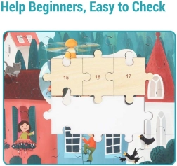 Każdy drewniany element ma na odwrocie numer. Dzieci poćwiczą logikę, liczenie i cierpliwość bez zbędnej frustracji.