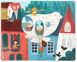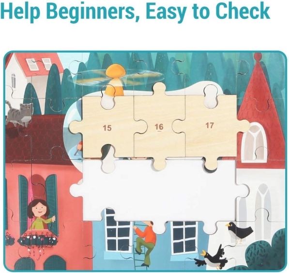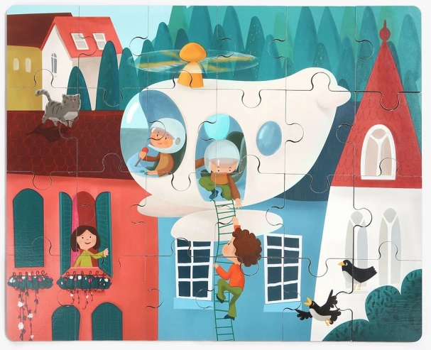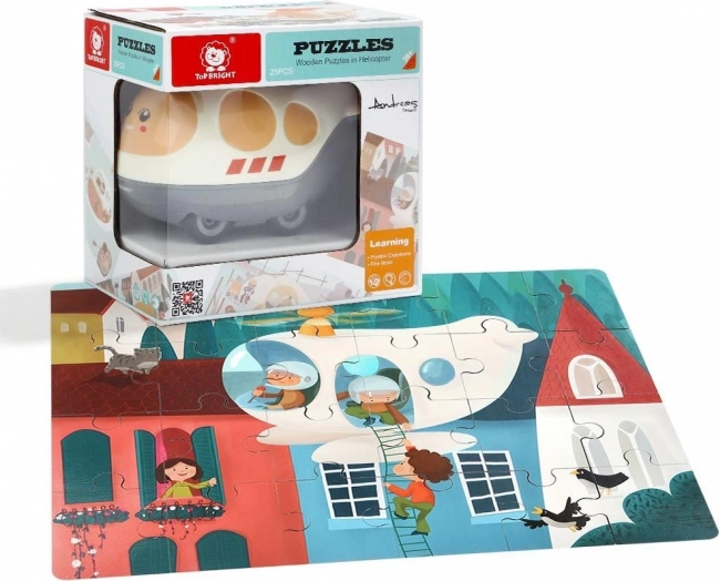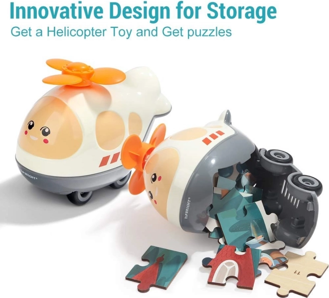Odkryj sprytną zabawkę 2 w 1: drewniane puzzle z motywem środków transportu oraz plastikowy helikopter z otwieraną pokrywą do przechowywania elementów i innych skarbów. Elementy puzzli są ponumerowane, więc dzieci łatwo się orientują, a układanie jest bardziej zabawne i pouczające.