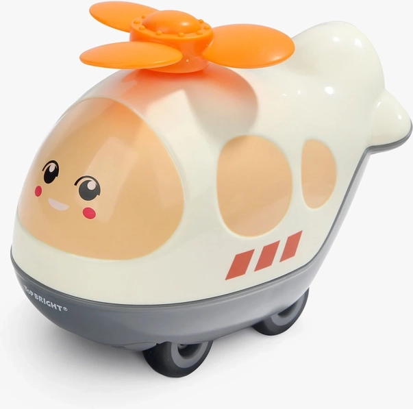 Plastikowy helikopter na kółkach ma od spodu otwieraną pokrywę, dzięki czemu dzieci mogą schować do niego całe puzzle lub swoje małe skarby.