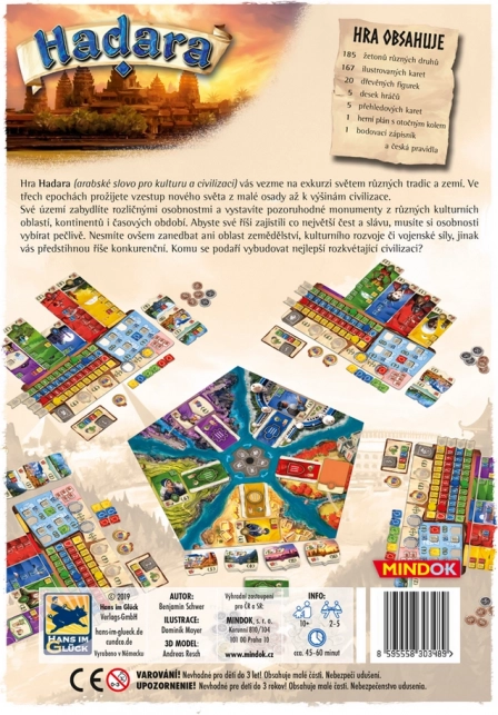 Wybierz się w podróż przez kultury i zbuduj własną cywilizację w trzech epokach. W sprytnie wyważonej strategii Hadara rekrutujesz osobistości, rozwijasz gospodarkę, kulturę i wojsko, a dzięki obrotowemu kołu wyboru kart tworzysz wydajny silnik prowadzący do chwały, sławy i punktów zwycięstwa.
