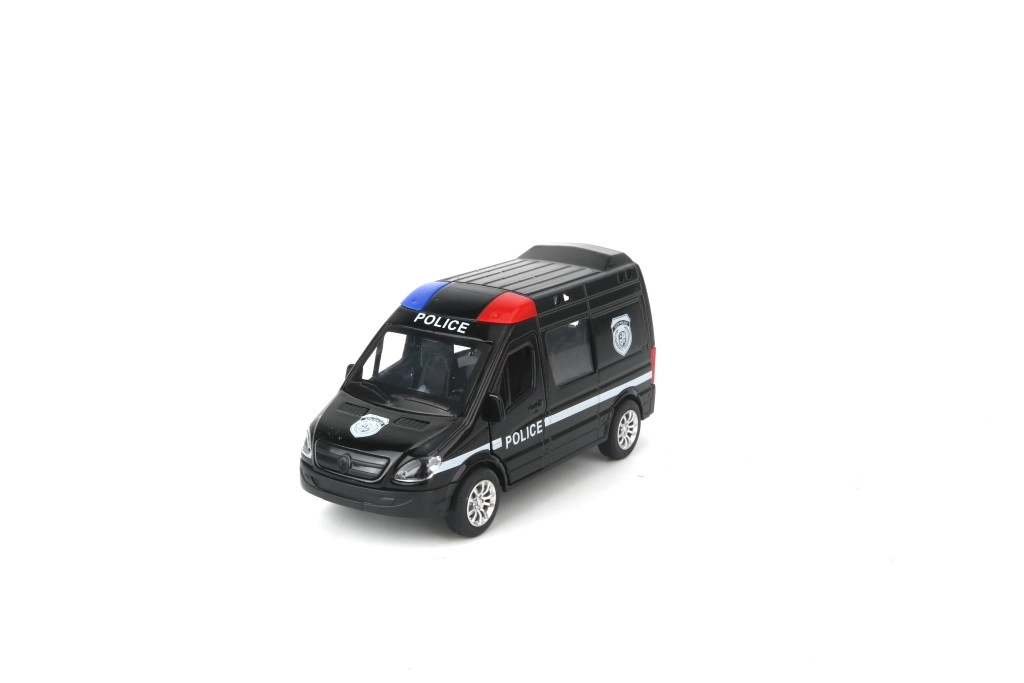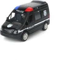 Czarny radiowóz z niebiesko-czerwonymi światłami i napisami POLICE pobudza do dynamicznej zabawy i pościgów – wystarczy naciągnąć i ruszyć.