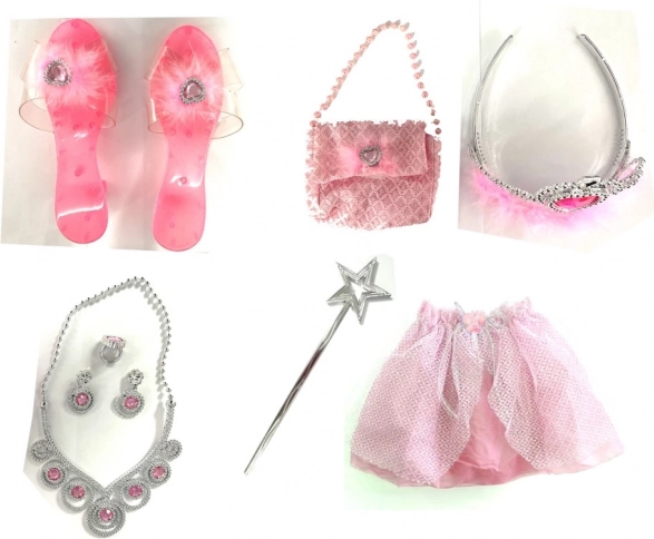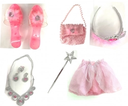 Czarujący różowy zestaw dla małych księżniczek zamieni każde popołudnie w bajkową przygodę. Dzieci pokochają połączenie lekkiej spódniczki, uroczych pantofelków i torebki, która dopełni cały królewski strój. Idealny do przebieranek, domowego teatru, na karnawał i urodzinowe przyjęcia.
