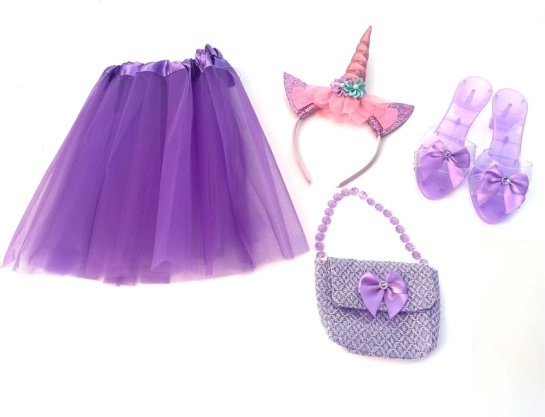 Spełnij marzenie każdej małej księżniczki dzięki temu kompletnemu zestawowi do przebierania – zawiera buciki, torebkę, spódniczkę i opaskę, idealny do odgrywania ról i rozwijania wyobraźni.