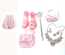 - Spódniczka, pantofelki, korona, torebka, czarodziejska różdżka, biżuteria