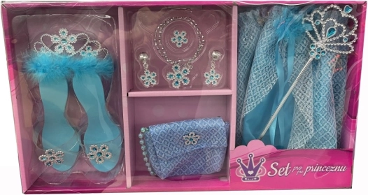 Spełnij marzenie każdej małej księżniczki dzięki temu zestawowi księżniczki w niebieskim kolorze. Zestaw zawiera spódniczkę, pantofelki, koronę, torebkę, różdżkę oraz biżuterię – wszystko, czego potrzeba do magicznej zabawy w księżniczkę.