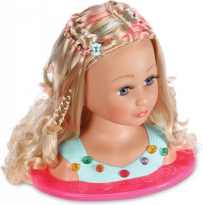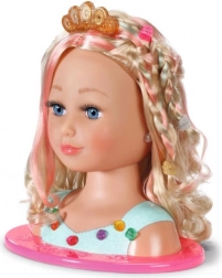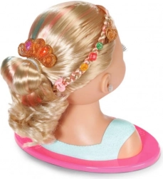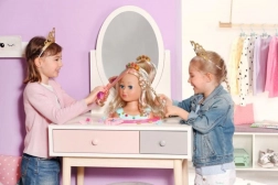 Odkryj kreatywne studio kosmetyczne dla małych stylistek: głowa do czesania z długimi blond włosami i delikatnymi pasemkami oferuje nieskończone możliwości fryzur i makijażu. W zestawie znajduje się paletka do makijażu (przetestowana dermatologicznie), szczotka, gumki, spinki i klamerki, błyszcząca korona oraz zapinane na klik kamyczki dla olśniewającego finalnego looku. Idealna do rozwijania wyobraźni, motoryki małej i długotrwałej zabawy.