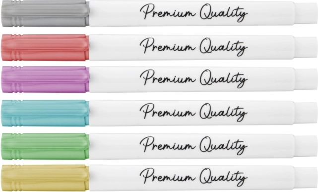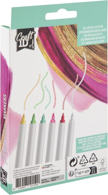 Odkryj kreatywne możliwości z tym zestawem sześciu metalicznych markerów Craft. Dzięki bogatym pigmentom kolory mają intensywne i żywe odcienie, które doskonale nadają się do detalicznych rysunków oraz równomiernego pokrywania większych powierzchni. Twórz oryginalne ilustracje, dekoracje i ręcznie robioną biżuterię bez ograniczeń wyobraźni.