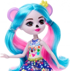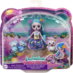 Odkryj świat fantazji z Enchantimals rodzina koali Joette. Ten zestaw jest częścią kolekcji Glam Party, gdzie wszyscy leśni przyjaciele doświadczają niesamowitych przygód ze swoimi zwierzątkami. Lalka Johana ma 15 cm wysokości, długie niebieskie włosy z różowymi pasmami, charakterystyczne uszy i żółty kwiat na głowie. Jest ubrana w oryginalną bluzkę i niebieską spódnicę, nosi niebieskie buty, a jej kończyny są ruchome.