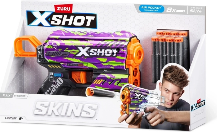 Wyróżnij się z tłumu dzięki personalizowanemu wyglądowi SKINS i wyzwij znajomych na pojedynek z lekkim, a jednocześnie wydajnym blasterem X-Shot Skins Flux. Dzięki technologii Air Pocket w strzałkach zyskasz stabilny lot i lepszą celność, a kompaktowe body pistoletu jest idealne do szybkiego poruszania się w pomieszczeniach i na zewnątrz.