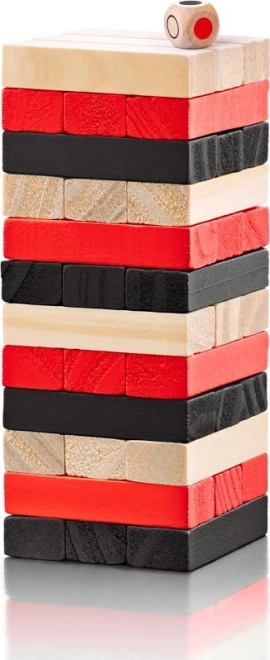 Buduj, wyjmuj i balansuj. Kolorowe drewniane klocki i kostka dodają nowe wyzwania i zmieniają każdą rundę w pełne napięcia show.