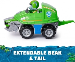 Odkryj zabawę inspirowaną serialem PSI PATROL. Dżunglowy pojazd Rocky’ego po naciśnięciu przedniej części transformuje się – wysuwa się żółwi dziób, z boku wyciągniesz ogon, a otwarcie paszczy dopełnia przełączenia w tryb akcji. Dzieci mogą łatwo odgrywać ulubione sceny i wymyślać nowe przygody w dzikiej dżungli.