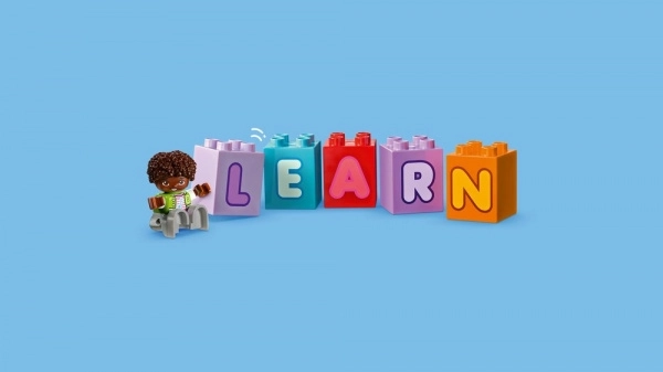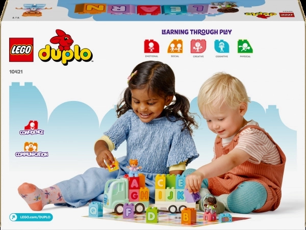 Ten kolorowy zestaw z serii LEGO DUPLO Miasto zamienia naukę alfabetu w świetną przejażdżkę. Dzieci doczepią odłączaną przyczepę do ciężarówki, ładują i rozładowują klocki z literami oraz rozwijają słownictwo i małą motorykę. Klocek z radiem i książeczka zachęcają do recytowania literek razem z rodzicami.
