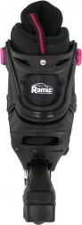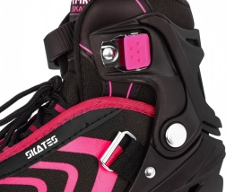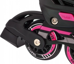 Potrójne zapięcie (sznurówki, rzep, klamra z blokadą) trzyma stopę pewnie na miejscu. Hamulec w prawej łyżwie umożliwia szybkie zatrzymanie.