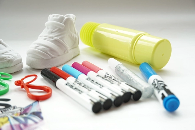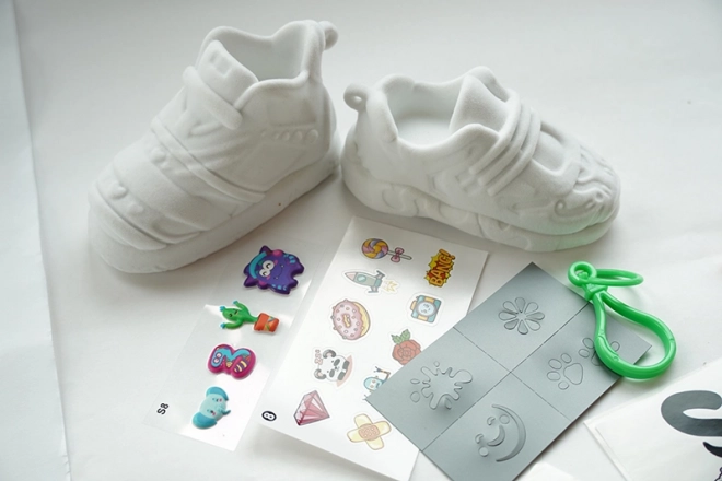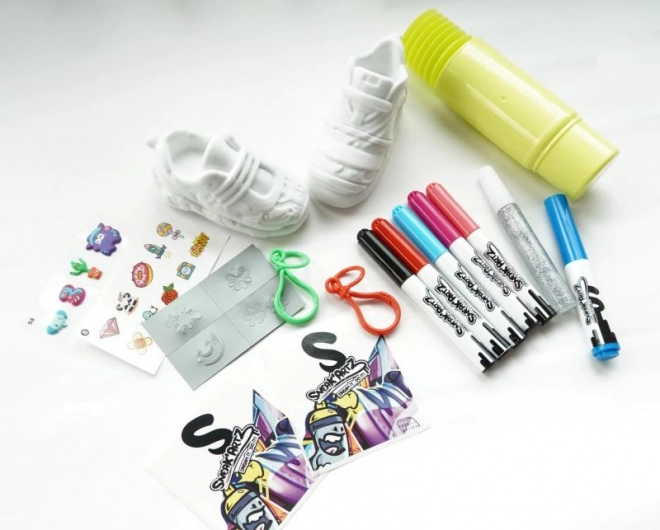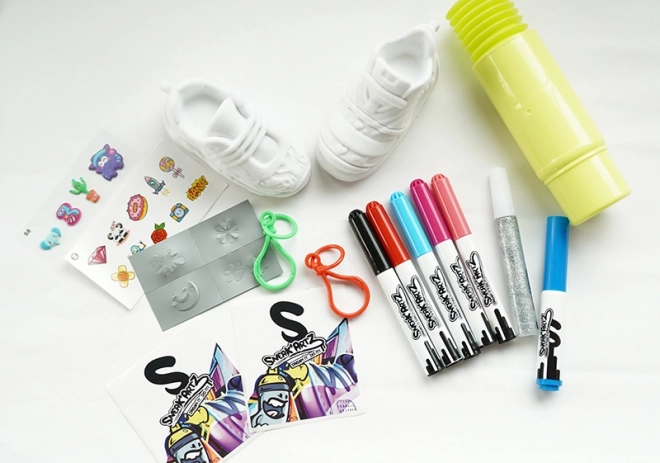 - Kompletny kreatywny zestaw: tenisówki, markery, brokat, naklejki, breloczki i lista kolekcjonerska.