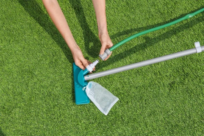 Zestaw zawiera takie elementy jak odkurzacz i siatka do efektywnego usuwania zanieczyszczeń z basenu.