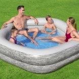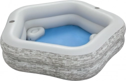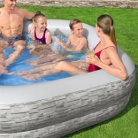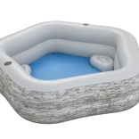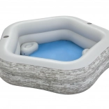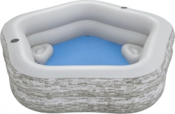 Ten oszczędzający miejsce narożny basen z kamiennym wzorem świetnie wpasuje się na taras i do ogrodu. Trwałe PVC oraz mocne ścianki zapewniają długą żywotność, a miękki górny rant zachęca do wygodnego siedzenia i orzeźwienia w upalne dni. Dzięki praktycznemu zaworowi spustowemu po kąpieli łatwo opróżnisz basen.