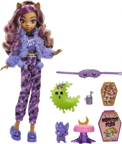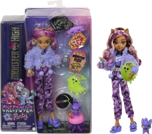 MONSTER HIGH Creepover Party Clawdeen Wolf – stylowa lalka z piżamowym strojem, pupilem Crescent i akcesoriami do nocnej zabawy.