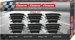 Opakowanie zawiera 6 elementów, co łącznie tworzy łuk 180°. Dzięki promieniowi R1 można tworzyć ostrzejsze odcinki, które zwiększają emocje wyścigu i zmienność układu. Dla perfekcyjnego wykończenia można dodać wewnętrzne pobocza 20590 oraz zewnętrzne pobocza 20567.