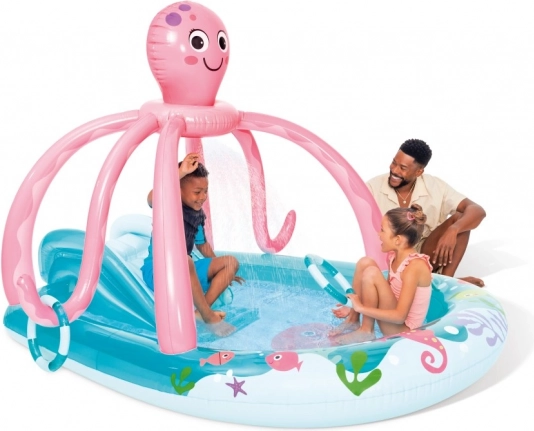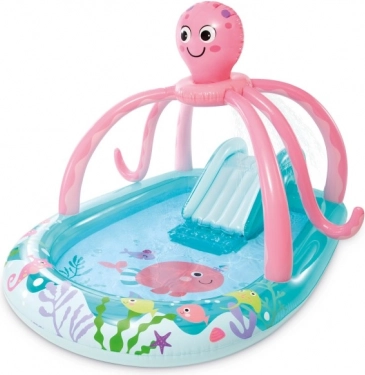 Podaruj dzieciom lato pełne śmiechu z tym przestronnym centrum zabaw z motywem ośmiornicy. Oferuje wbudowany natrysk wodny dla orzeźwienia, wygodną, dodatkowo nadmuchiwaną matę, małą zjeżdżalnię oraz bogate zdobienia o motywach morskich. W zestawie znajdują się dwa nadmuchiwane kółka oraz łatka naprawcza. Idealne do zabawy na świeżym powietrzu w ogrodzie.