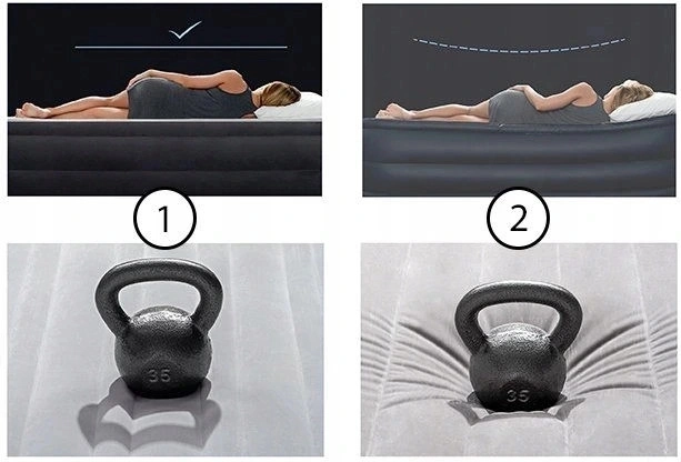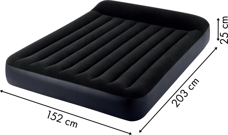 Wbudowana elektryczna pompa (220–240 V) napompuje łóżko w około 250 sekund. Dzięki praktycznemu zaworowi materac można w kilka chwil spuścić z powietrza, złożyć i schować. Zintegrowana, podwyższona poduszka wspiera prawidłowe ułożenie głowy i karku.